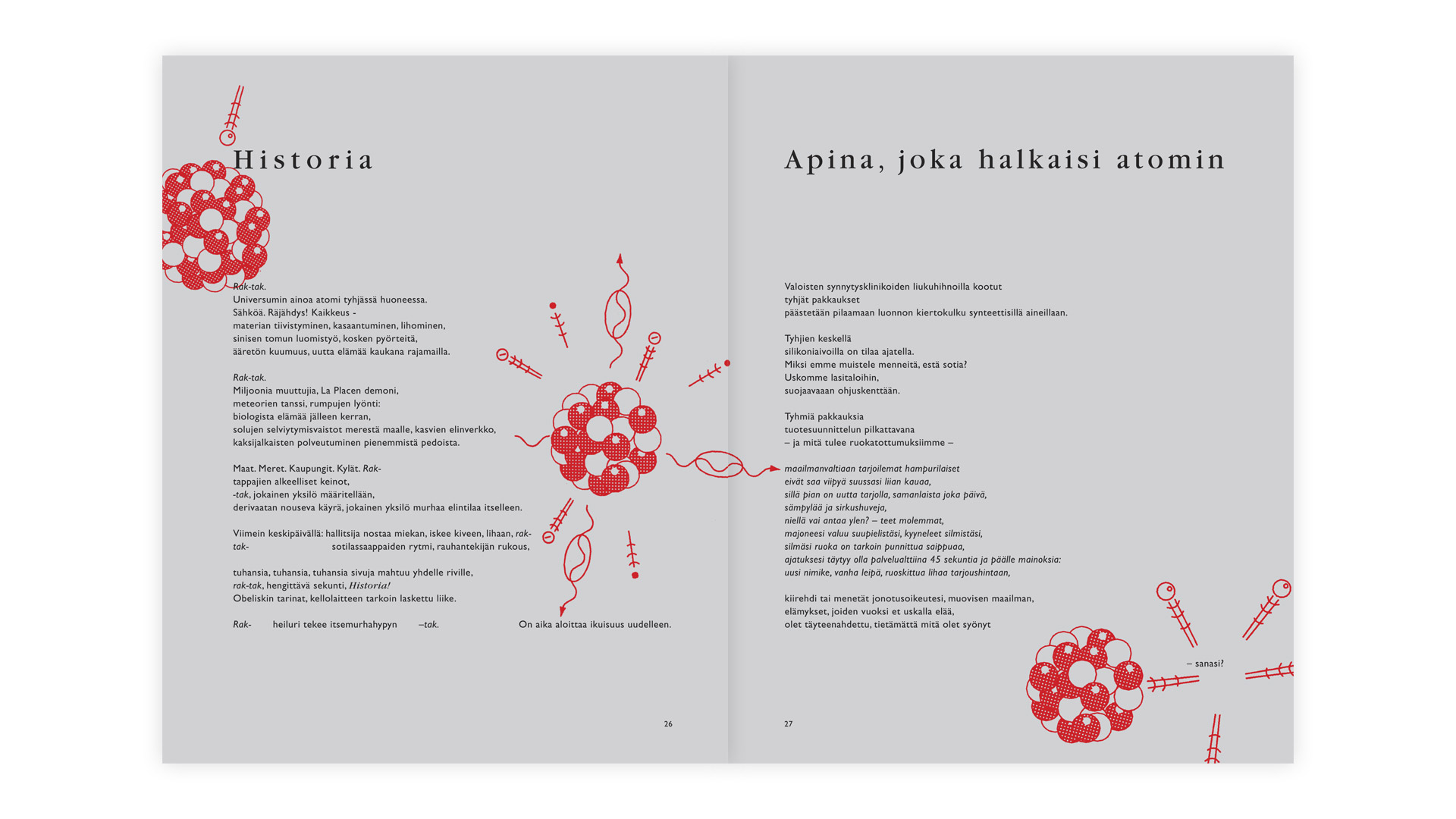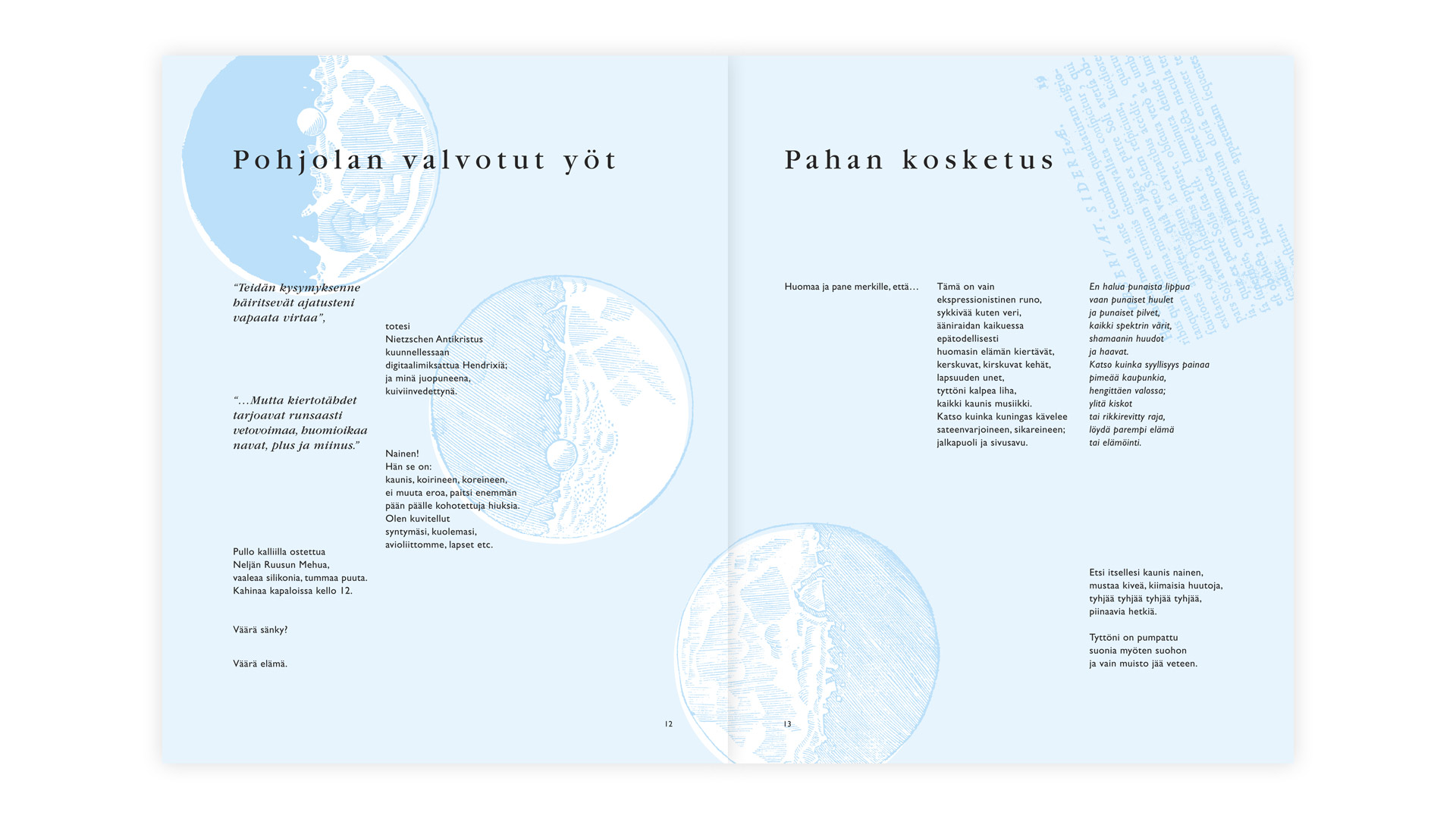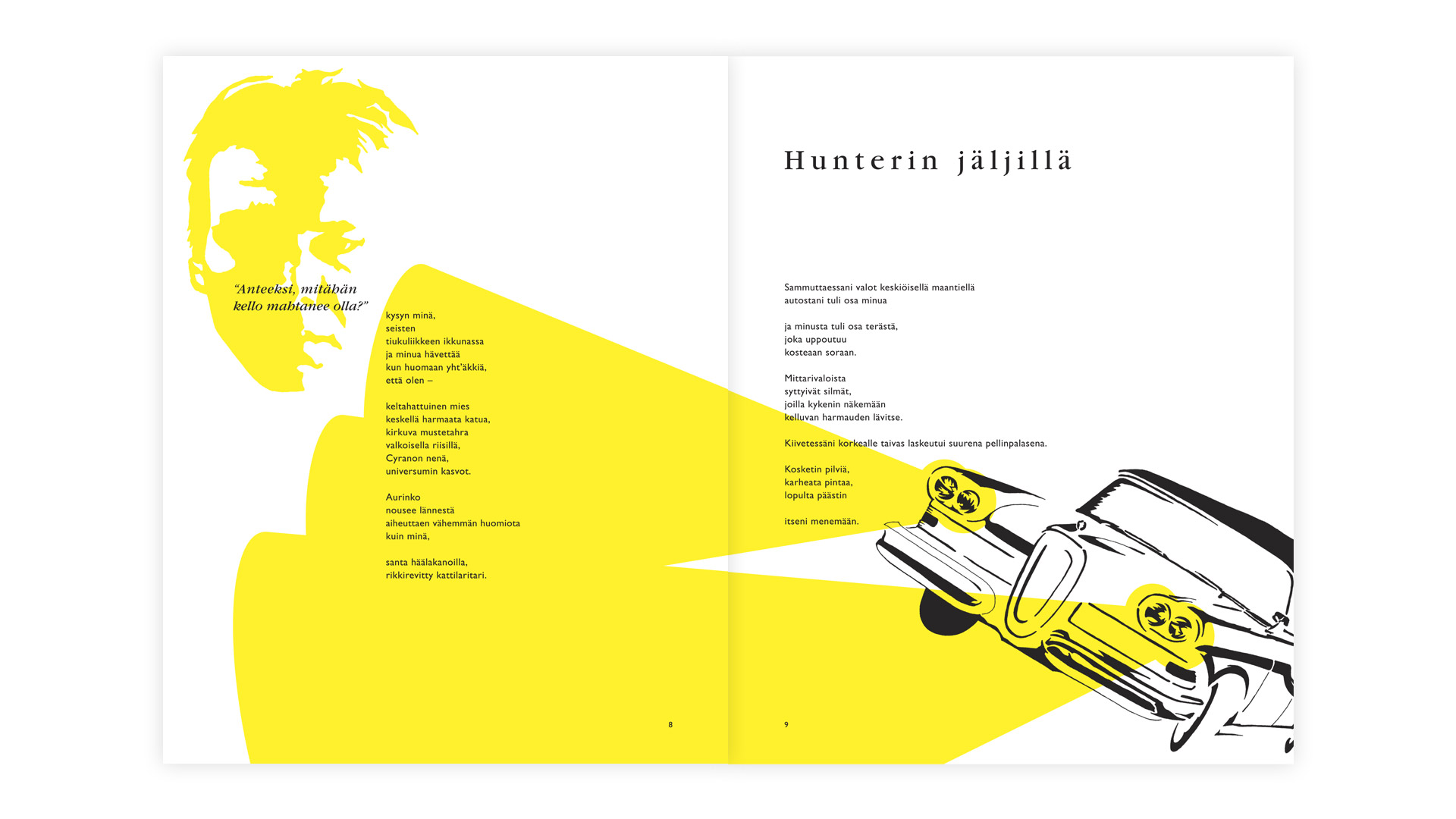 Kirjaan kokosin vuosien mittaan kirjoittamiani runoja, jotka kuvitin eri tekniikoilla. Päättötyön tekstiosassa analysoin runokirjojen yleisiä tyylejä, jonka perusteelta pyrin tässä toteutuksessa yleisestä linjasta poikkeavaan värikkääseen toteutustapaan.