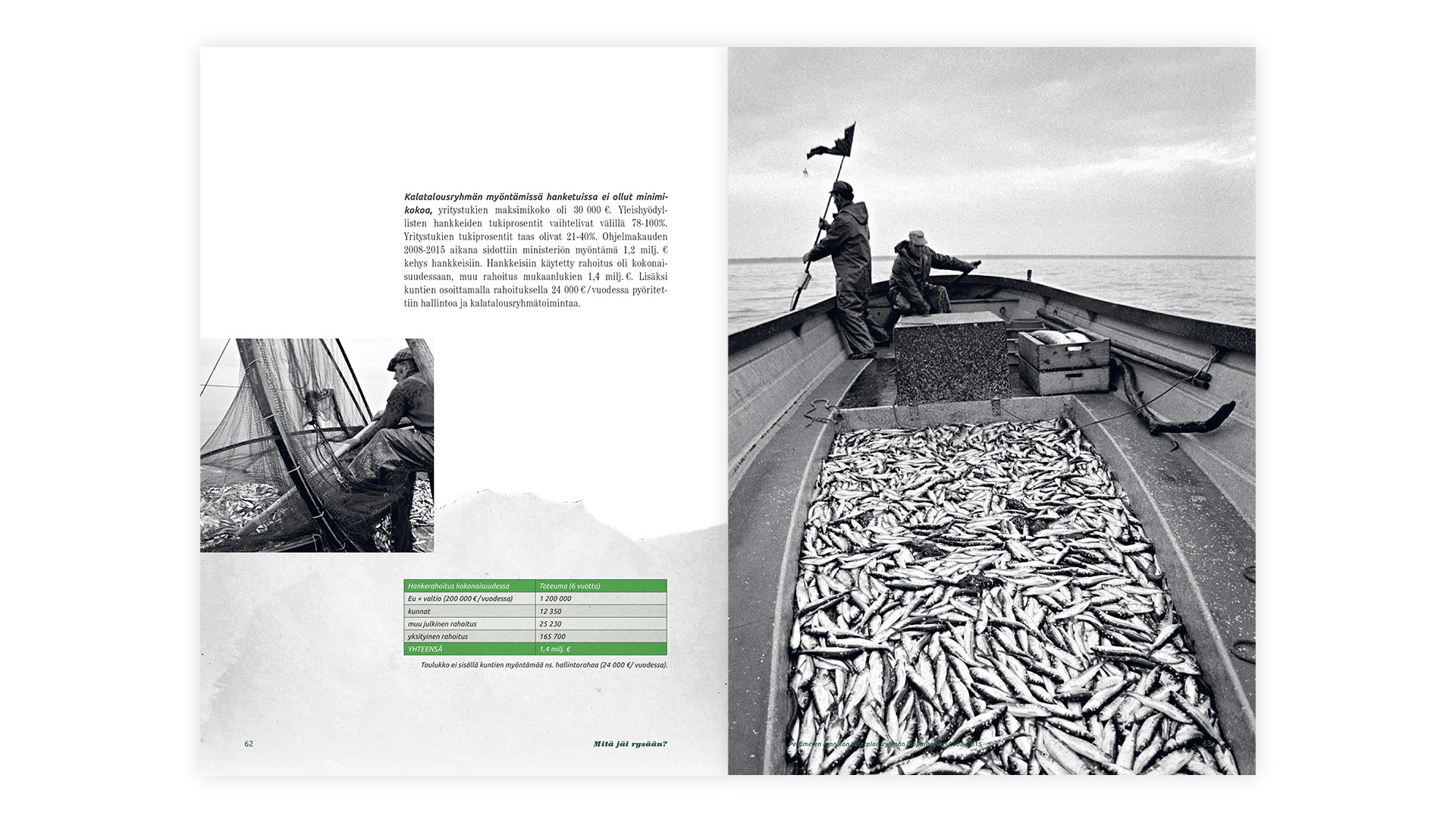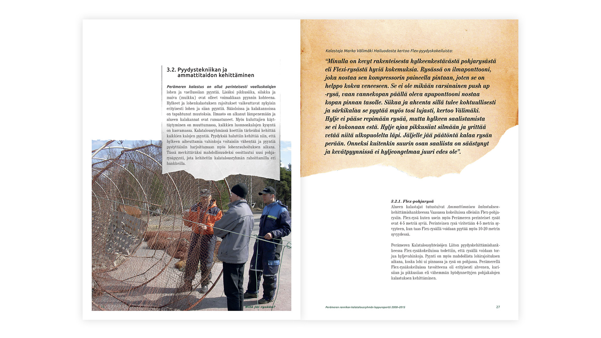 Vuonna 2015 suunnittelin ja taitoin ”Mitä jäi rysään? – Perämeren rannikon kalatalousryhmän loppuraportin 2008–2015”. Raportissa käytiin läpi ohjelman toimeenpano, toiminnan tulokset ja niiden tarkastelu, taloudellinen toteuma sekä linjattiin kalatalouden kehittämistä.