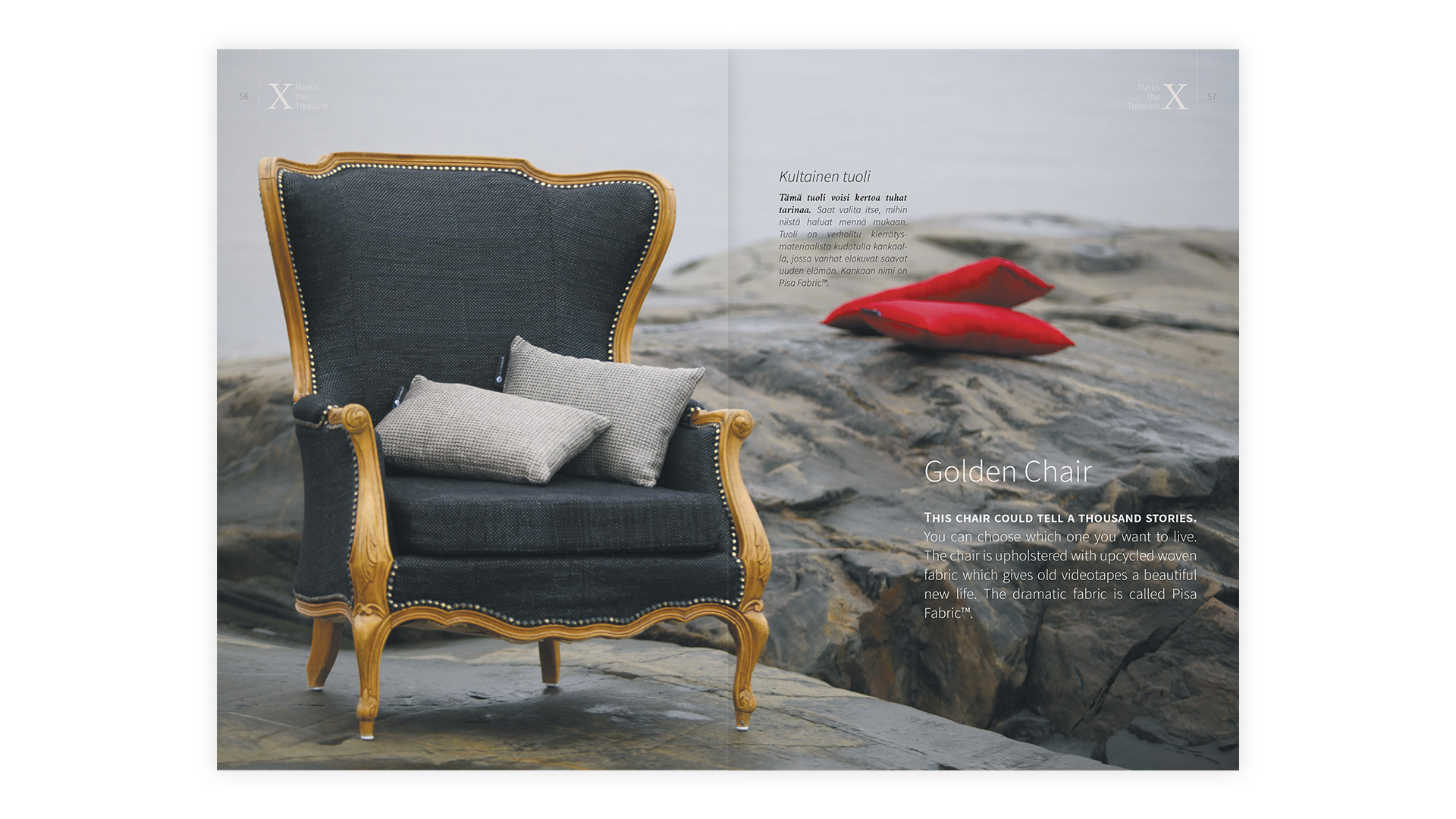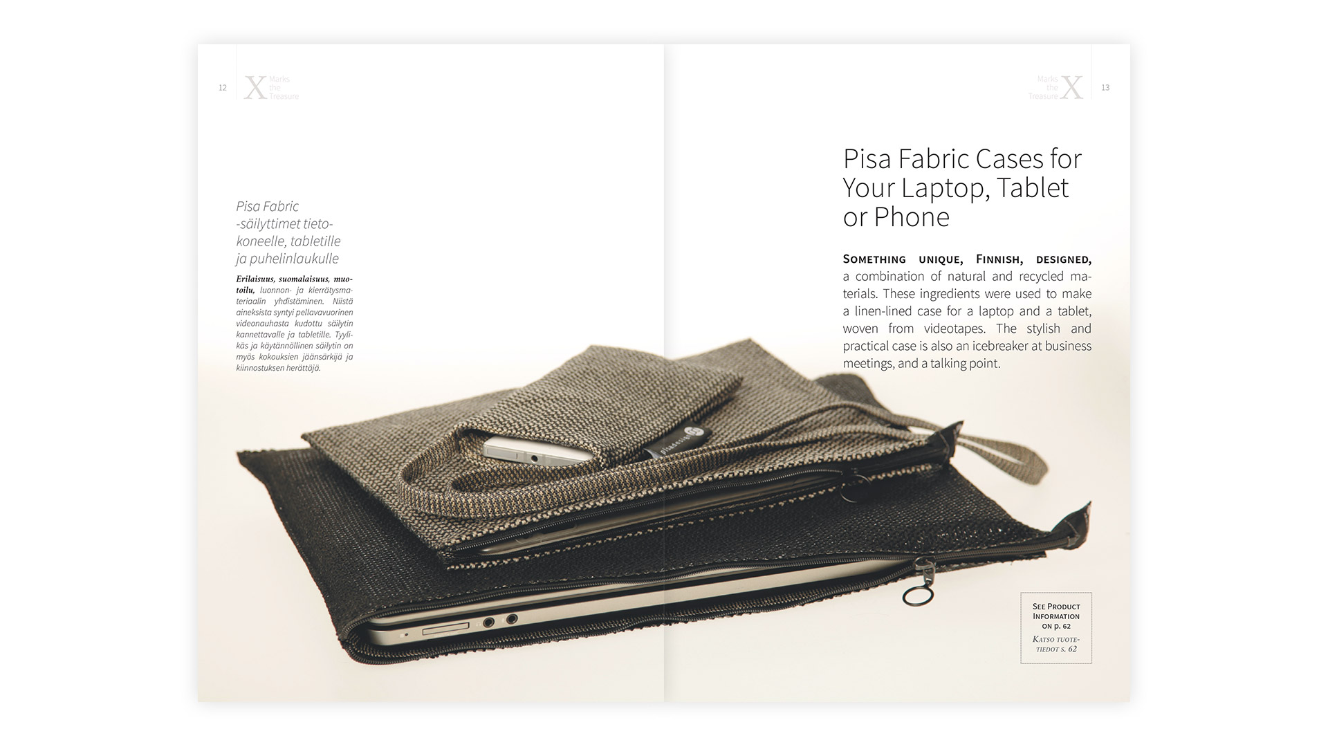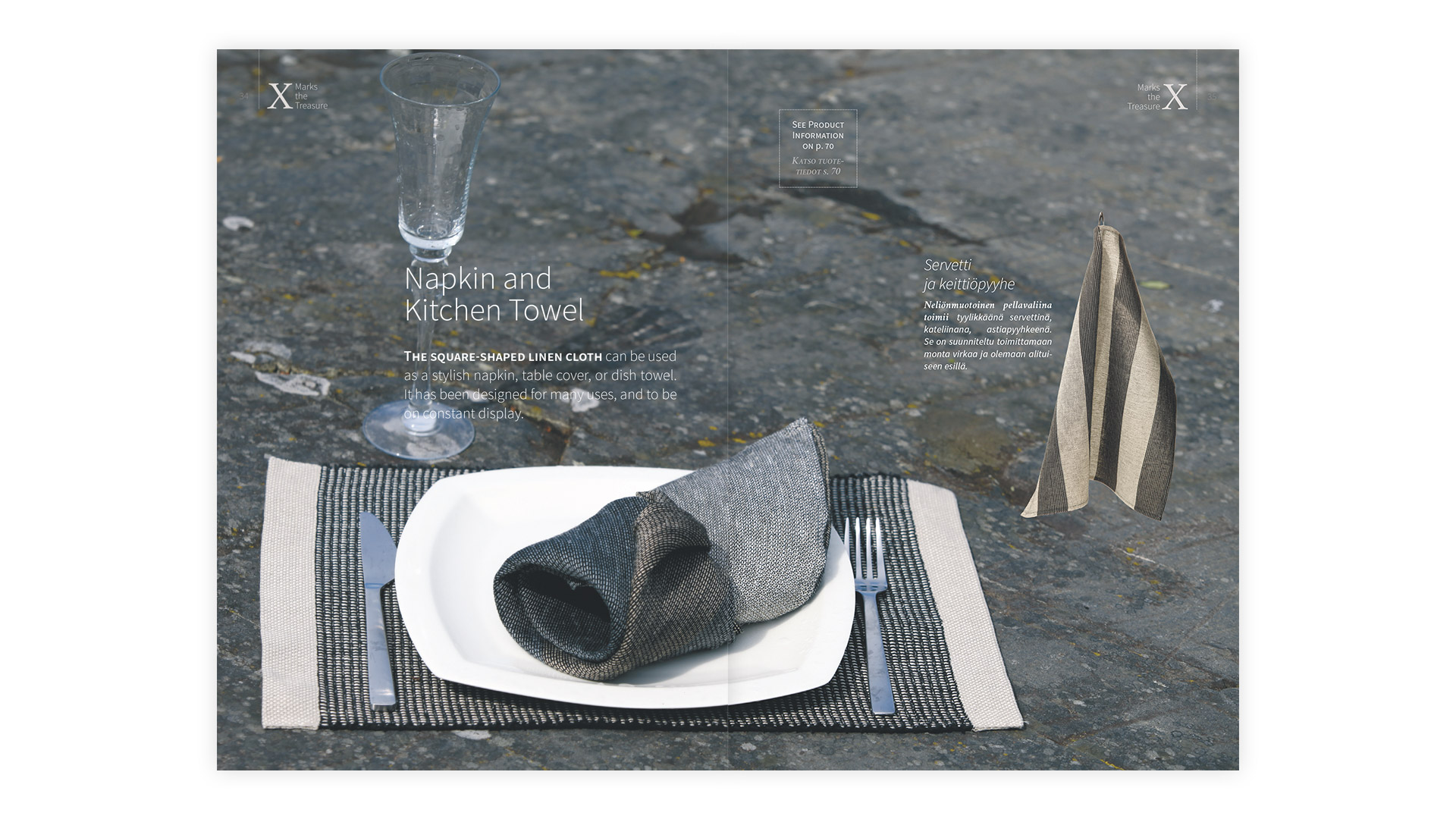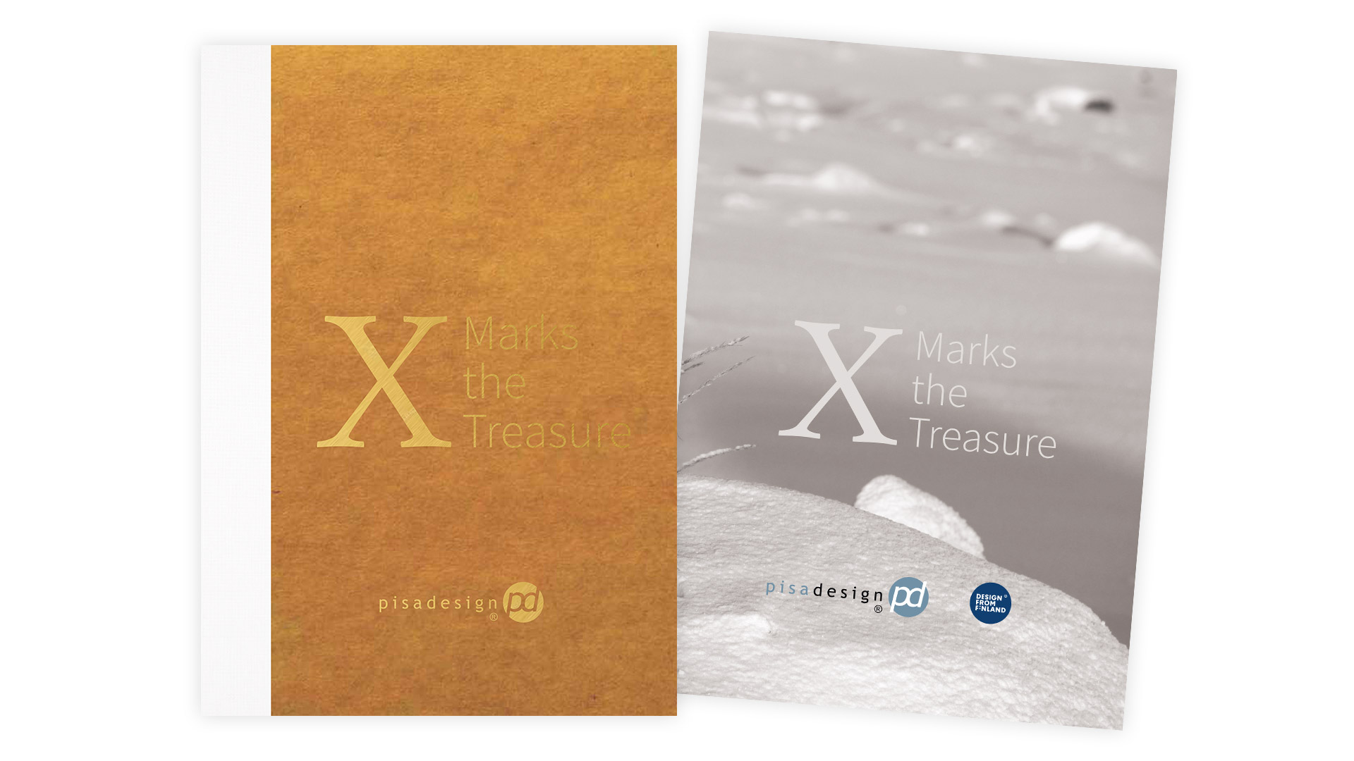 ”X Marks the Treasure” -tuotekirja kokosi yrityksen siihenastisen malliston esittelyineen kahdella kielellä, jonka kokosin visuaalisesti uusvanhaksi kirjaksi. Kirjan logotyyppi toteutettiin etukannessa folioinnilla raakakartongin päälle ja selkämyksen ylitti valkoinen puolikluutti.